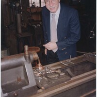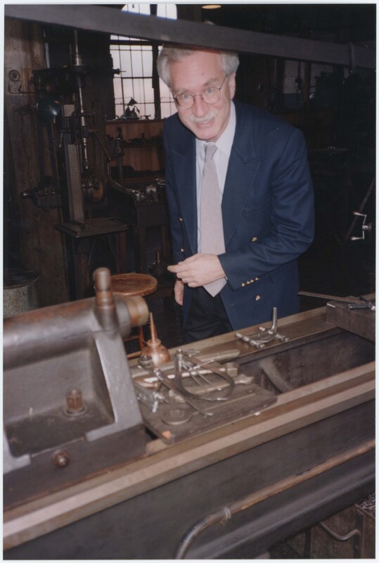 Neil Baldwin posing for a photo behind a large piece of machinery at the Thomas Edison National Historical Park.