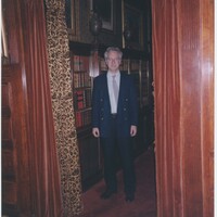 Neil Baldwin standing inside a doorway to what appears to be a library within the Thomas Edison National Historical Park.