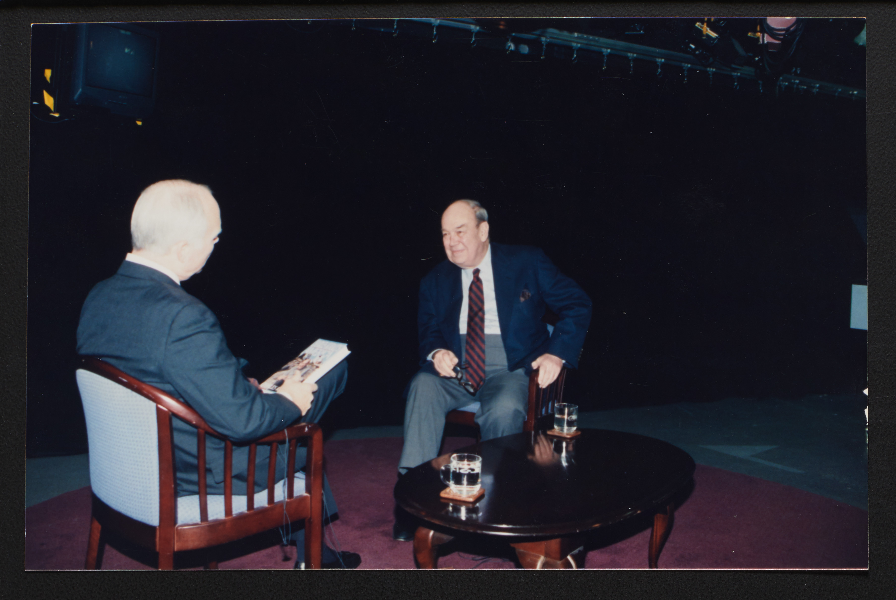 Brian Lamb sits with journalist Charles Kuralt when Kuralt appeared on Booknotes to discuss his book "Charles Kuralt's America."