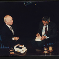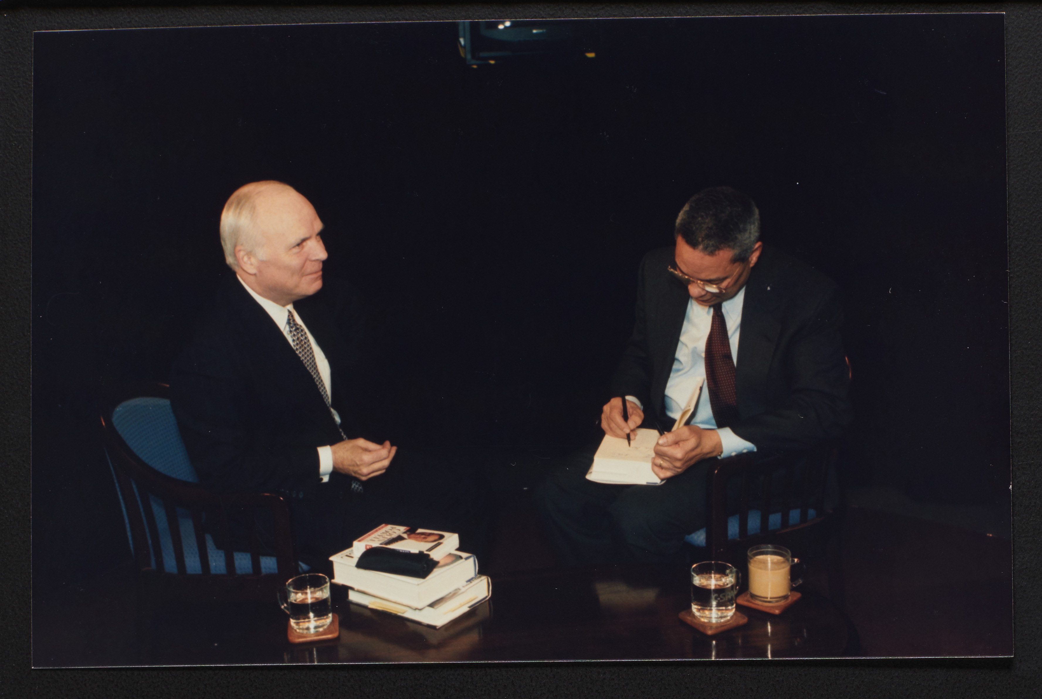 Brian Lamb smiles as he sits with former Secretary of State Colin Powell as Powell signs a copy of his book "My American Journey." Powell appeared on Booknotes to discuss the book.