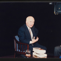 Brian Lamb gestures as he sits with former Secretary of State Colin Powell as Powell signs a copy of his book "My American Journey." Powell appeared on Booknotes to discuss the book.