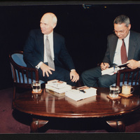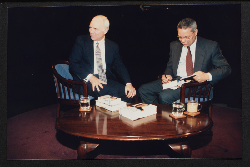 Brian Lamb looks around as he sits with former Secretary of State Colin Powell as Powell signs a copy of his book "My American Journey." Powell appeared on Booknotes to discuss the book.