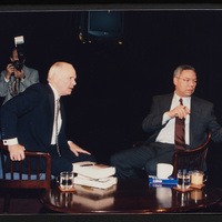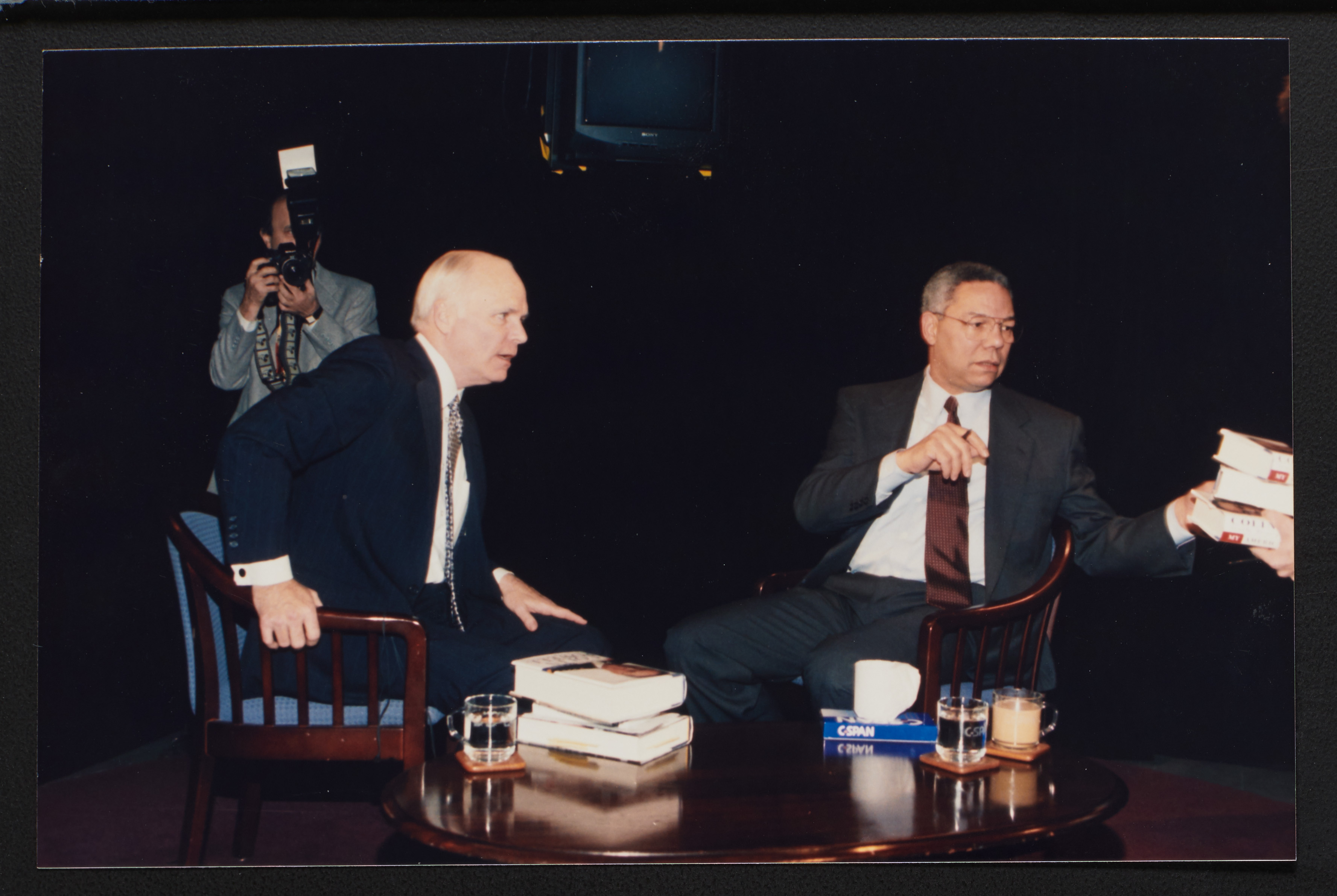 Brian Lamb sits with former Secretary of State Colin Powell as camera crew members look on when Powell appeared on Booknotes to discuss his book "My American Journey."