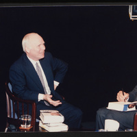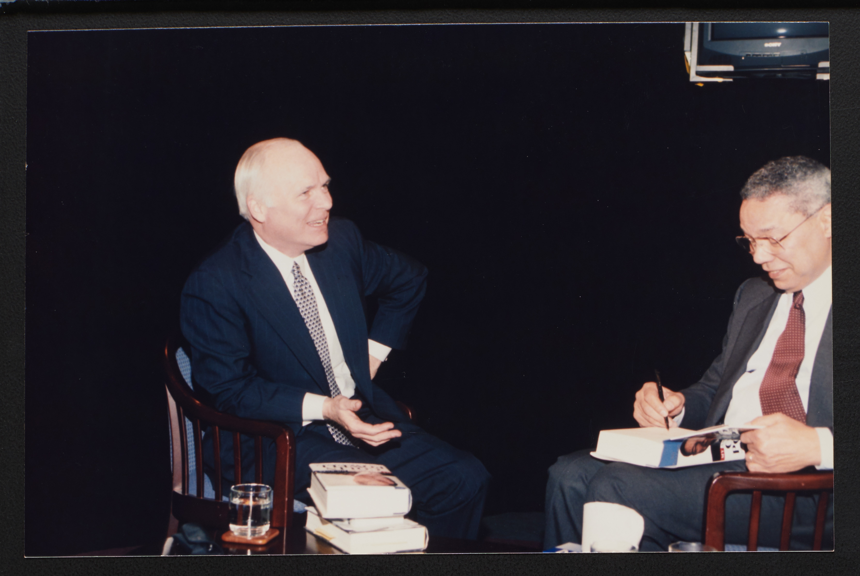 Brian Lamb smiles as he sits with former Secretary of State Colin Powell as Powell signs a copy of his book "My American Journey." Powell appeared on Booknotes to discuss the book.