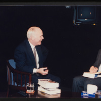 Brian Lamb smiles as he sits with former Secretary of State Colin Powell as Powell signs a copy of his book "My American Journey." Powell appeared on Booknotes to discuss the book.