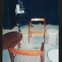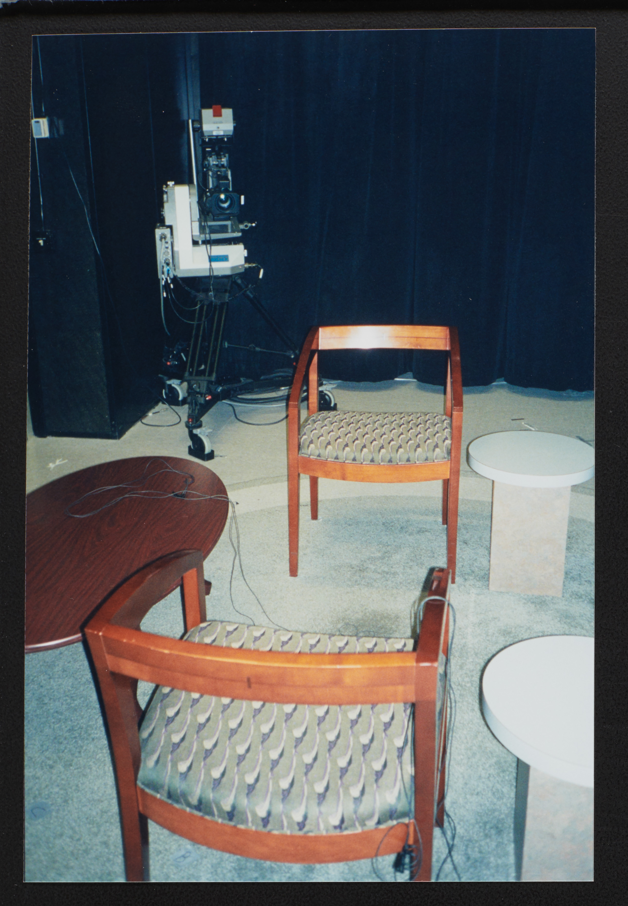 - Two empty chairs with cables running around sit in the Booknotes studio at C-SPAN.