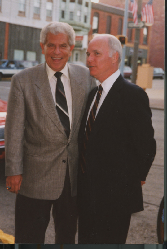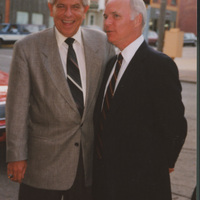 Brian Lamb and another person pose together on the sidewalk of a road. This photograph was taken as part of filming C-SPAN's Lincoln-Douglas Debates series in Freeport, Illinois.