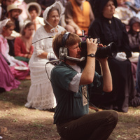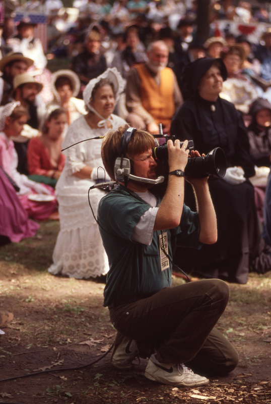 A cameraperson with a headset crouches down on the ground while looking through a camera. People in 19th-century period costume sit in the background. This photograph was taken as part of filming C-SPAN's Lincoln-Douglas Debates series in Freeport, Illinois.