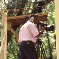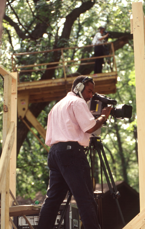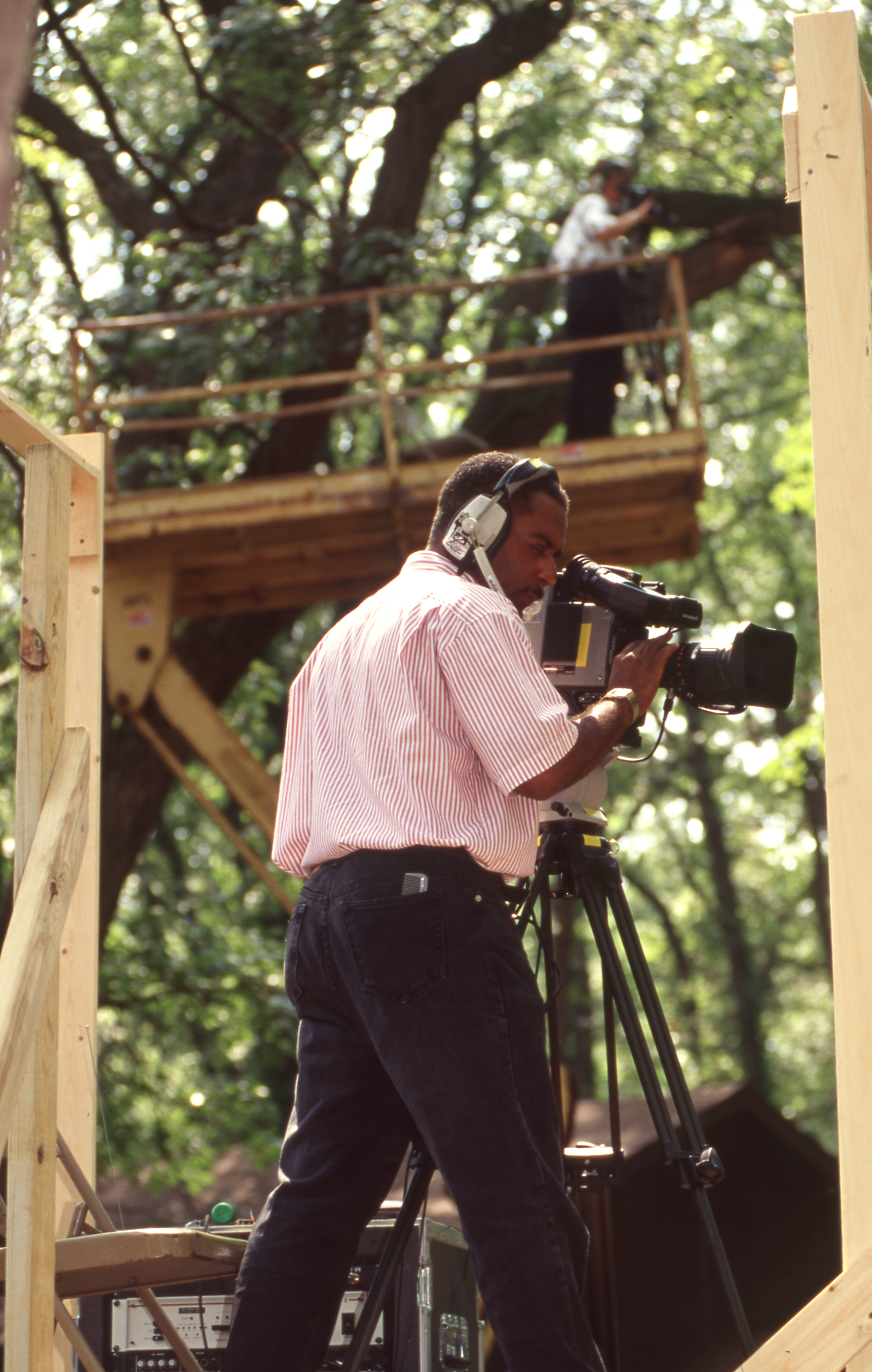 A cameraperson looks through a camera while standing on a wooden platform. Another cameraperson on a higher platform also films through a camera. This photograph was taken as part of filming C-SPAN's Lincoln-Douglas Debates series in Freeport, Illinois.