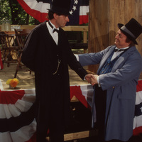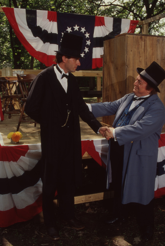 Two people, one dressed as Abraham Lincoln, the other dressed as Stephen Douglas, shake hands in front of the debate platform near a podium and red, white, and blue banners with stars. This photograph was taken as part of filming C-SPAN's Lincoln-Douglas Debates series in Freeport, Illinois.