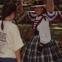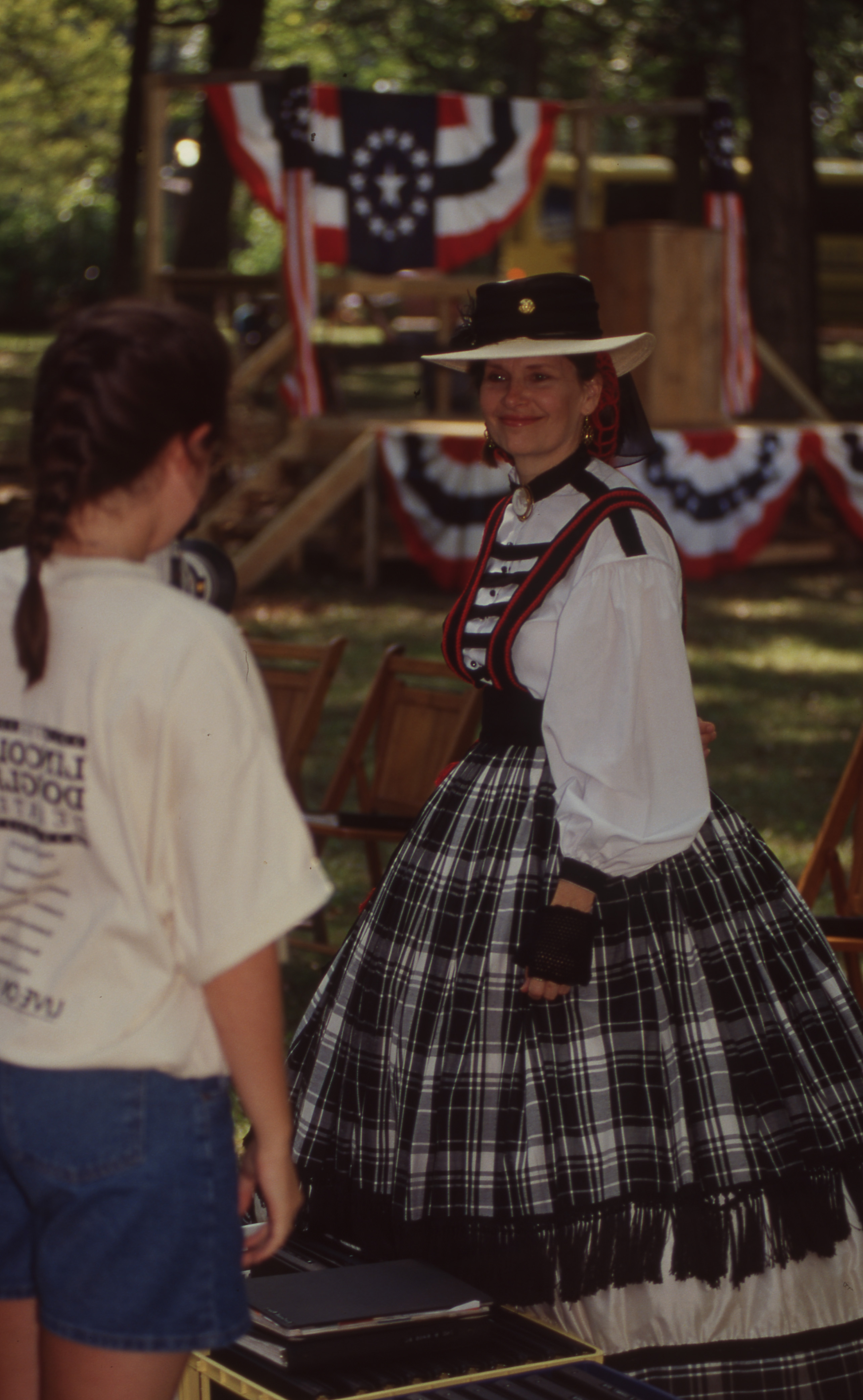 A person dressed in a 19th-century period dress smiles at a young person in jean shorts and a "Lincoln-Douglas Debates" t-shirt. This photograph was taken as part of filming C-SPAN's Lincoln-Douglas Debates series in Freeport, Illinois.