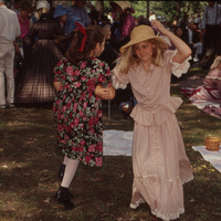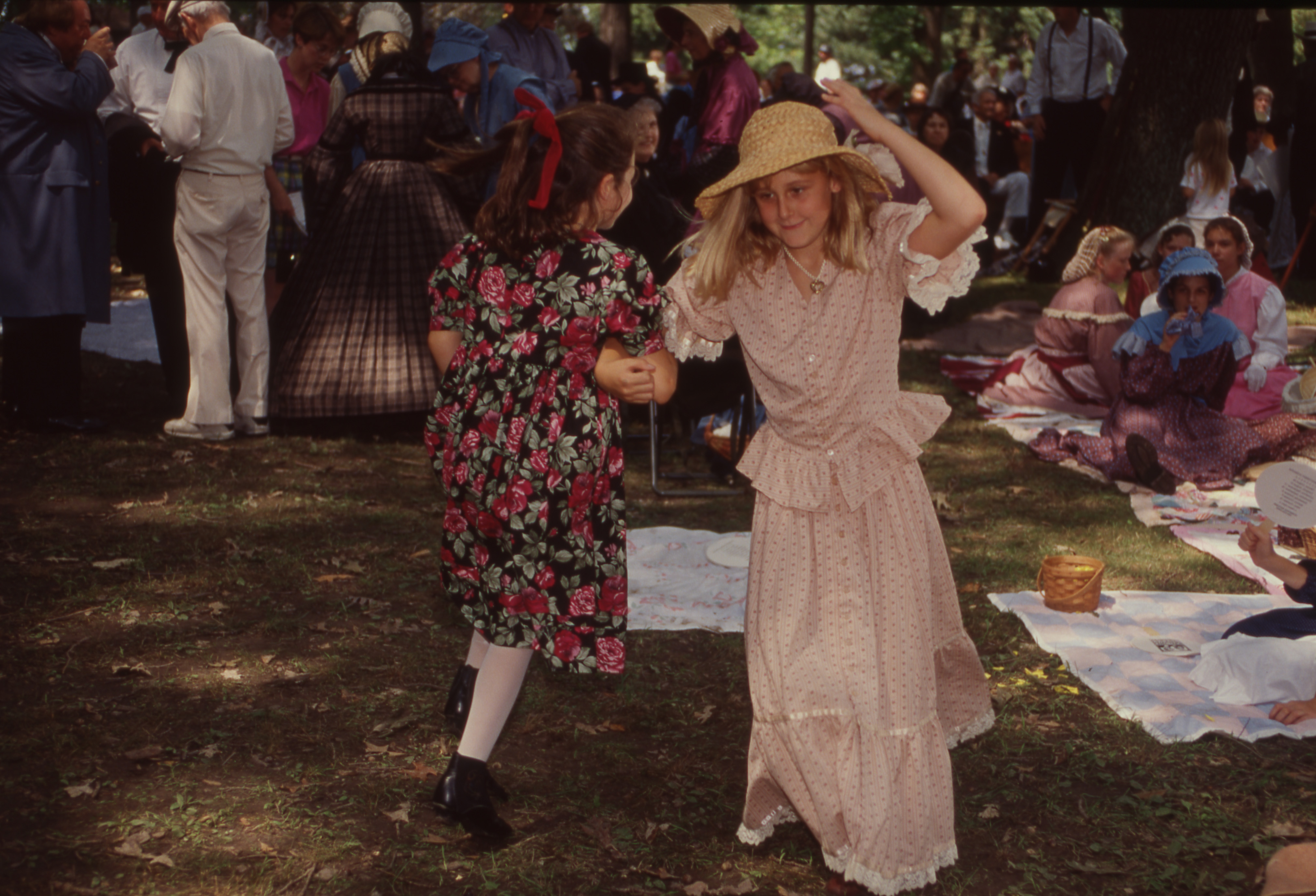 Two children in long dresses skip in a circle arm in arm, while other children in 19th-century period costumes sitting on blankets look on. A large crowd stands behind them. This photograph was taken as part of filming C-SPAN's Lincoln-Douglas Debates series in Freeport, Illinois.