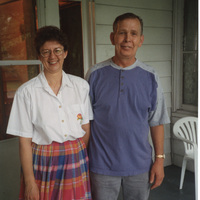Two people pose together while standing on a porch. This photograph was taken as part of filming C-SPAN's Lincoln-Douglas Debates series in Jonesboro, Illinois.