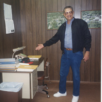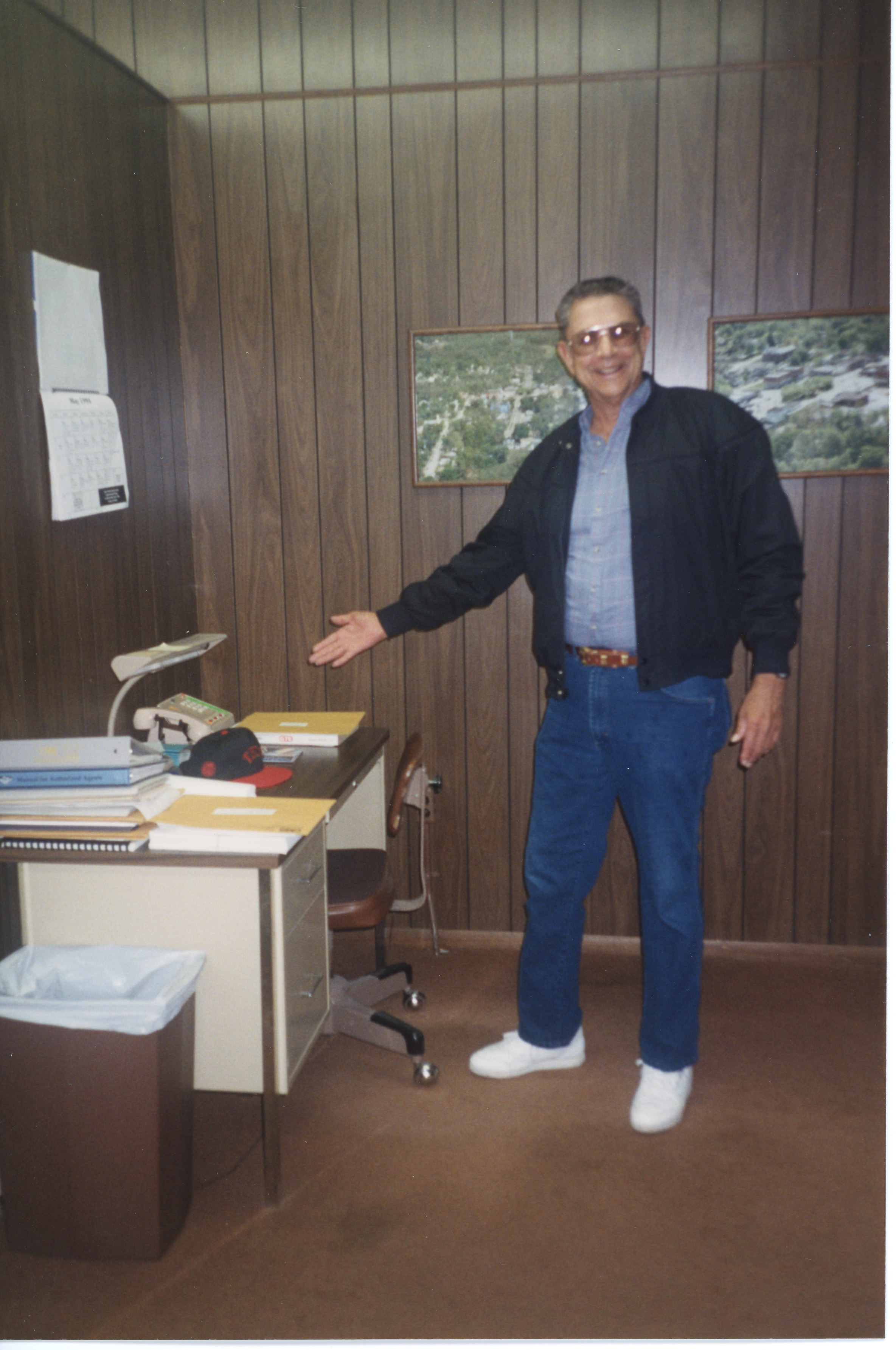 An older person wearing jeans and a black jacket gestures to a small desk stacked with papers in a wood-paneled room. This photograph was taken as part of filming C-SPAN's Lincoln-Douglas Debates series in Jonesboro, Illinois.