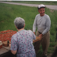 Three people stand outside around a table with small cartons of picked strawberries on a picnic table. This photograph was taken as part of filming C-SPAN's Lincoln-Douglas Debates series in Jonesboro, Illinois.