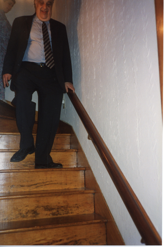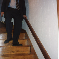 Two people walk down a wooden set of stairs. This photograph was taken as part of filming C-SPAN's Lincoln-Douglas Debates series in Jonesboro, Illinois.