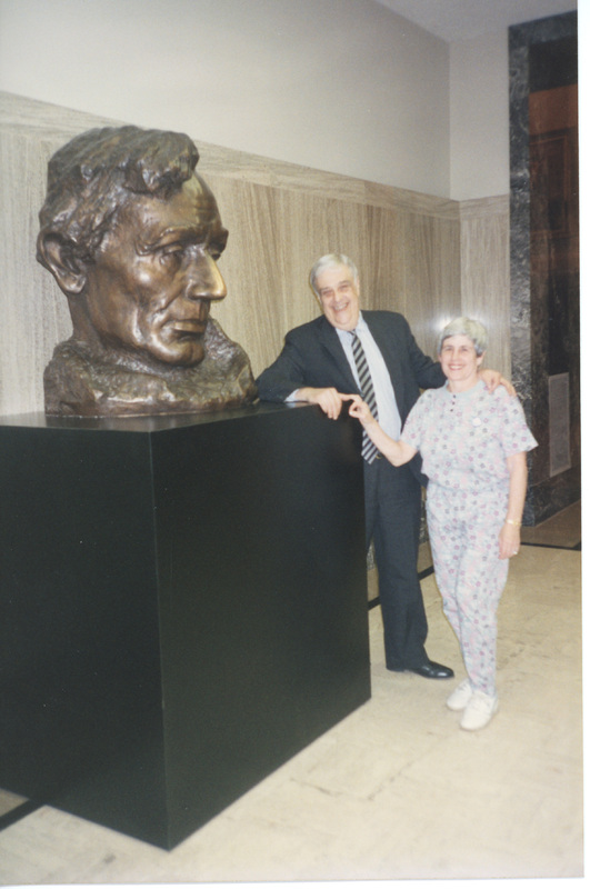 A person in a suit and a person in a floral outfit stand near a large bronze head of Abraham Lincoln on a large platform. This photograph was taken as part of filming C-SPAN's Lincoln-Douglas Debates series in Jonesboro, Illinois.