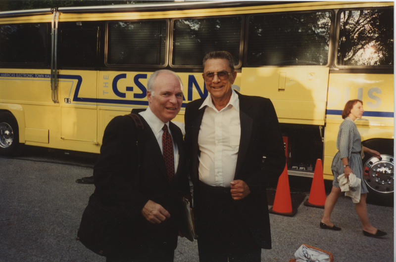Brian Lamb and another person stand in front of the C-SPAN Bus. This photograph was taken as part of filming C-SPAN's Lincoln-Douglas Debates series in Jonesboro, Illinois.