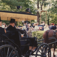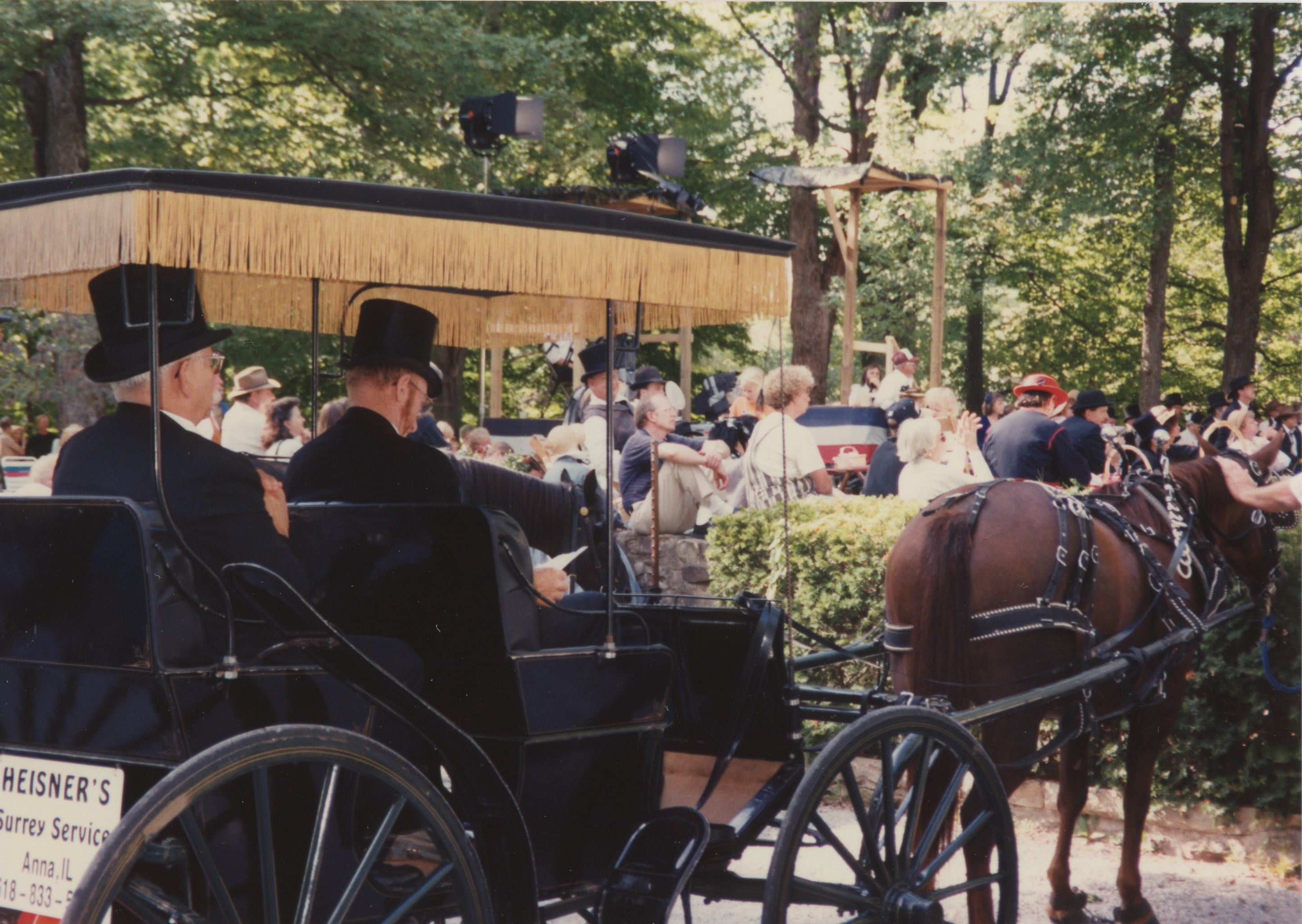 Two people in a horse-drawn surrey approach an outdoor event where many people are gathered. This photograph was taken as part of filming C-SPAN's Lincoln-Douglas Debates series in Jonesboro, Illinois.
