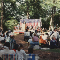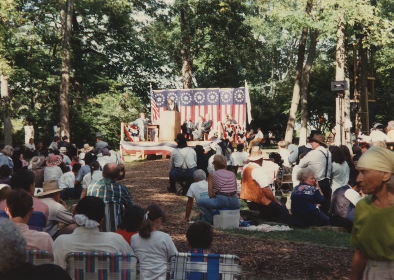 People sit watching an outdoor event where a person dressed as Abraham Lincoln addresses them from a wooden platform adorned in star and stripe banners. This photograph was taken as part of filming C-SPAN's Lincoln-Douglas Debates series in Jonesboro, Illinois.