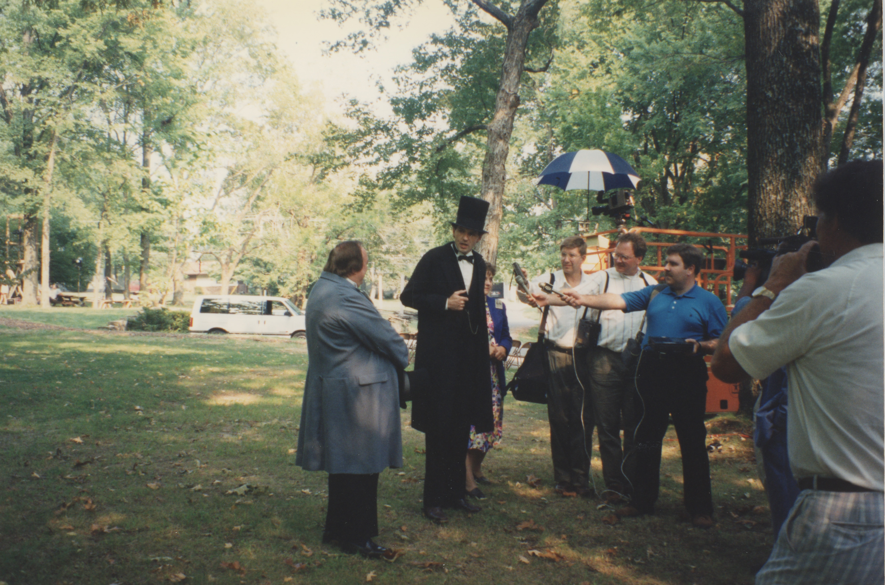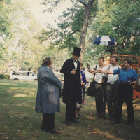 A group of video production team surround two people dressed as Stephen Douglas and Abraham Lincoln for a local news conference prior to the Lincoln-Douglass Debate re-enactment. This photograph was taken as part of filming C-SPAN's Lincoln-Douglas Debates series in Jonesboro, Illinois.