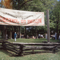 The back of a large banner which reads "The Peoples Choice, Welcome to Jonesboro" hands on wooden posts over a log fence. This photograph was taken as part of filming C-SPAN's Lincoln-Douglas Debates series in Jonesboro, Illinois.