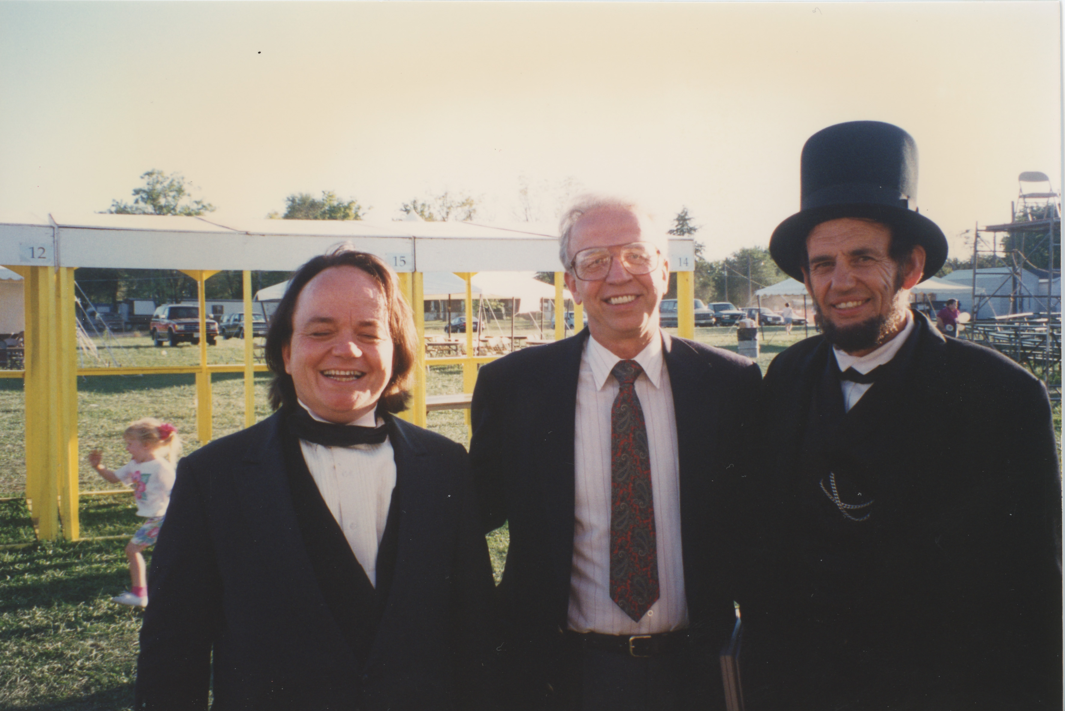 Three people--B.F. McClerren, dressed as Abraham Lincoln, Russel Brazzel dressed as Stephen Douglas, and one in a contemporary suit--pose together outdoors. This photograph was taken as part of filming C-SPAN's Lincoln-Douglas Debates series in Charleston, Illinois.
