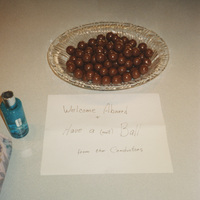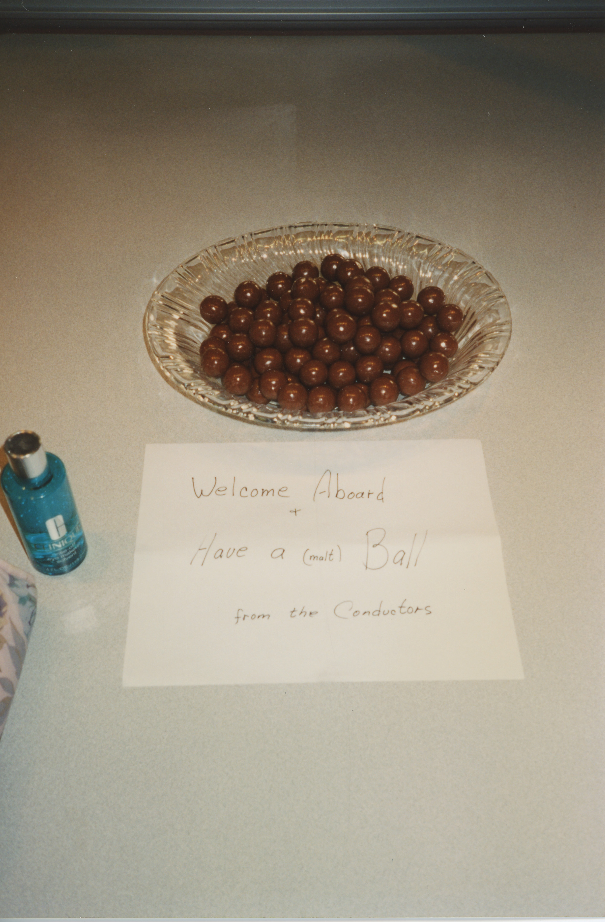 A glass bowl of chocolate malt balls on a countertop with a note that reads "Welcome Aboard & Have a (malt) Ball from the Conductors." This photograph was taken while the C-SPAN crew was en route from Chicago, Illinois to Galesburg, Illinois while filming the Lincoln-Douglas Debates series.