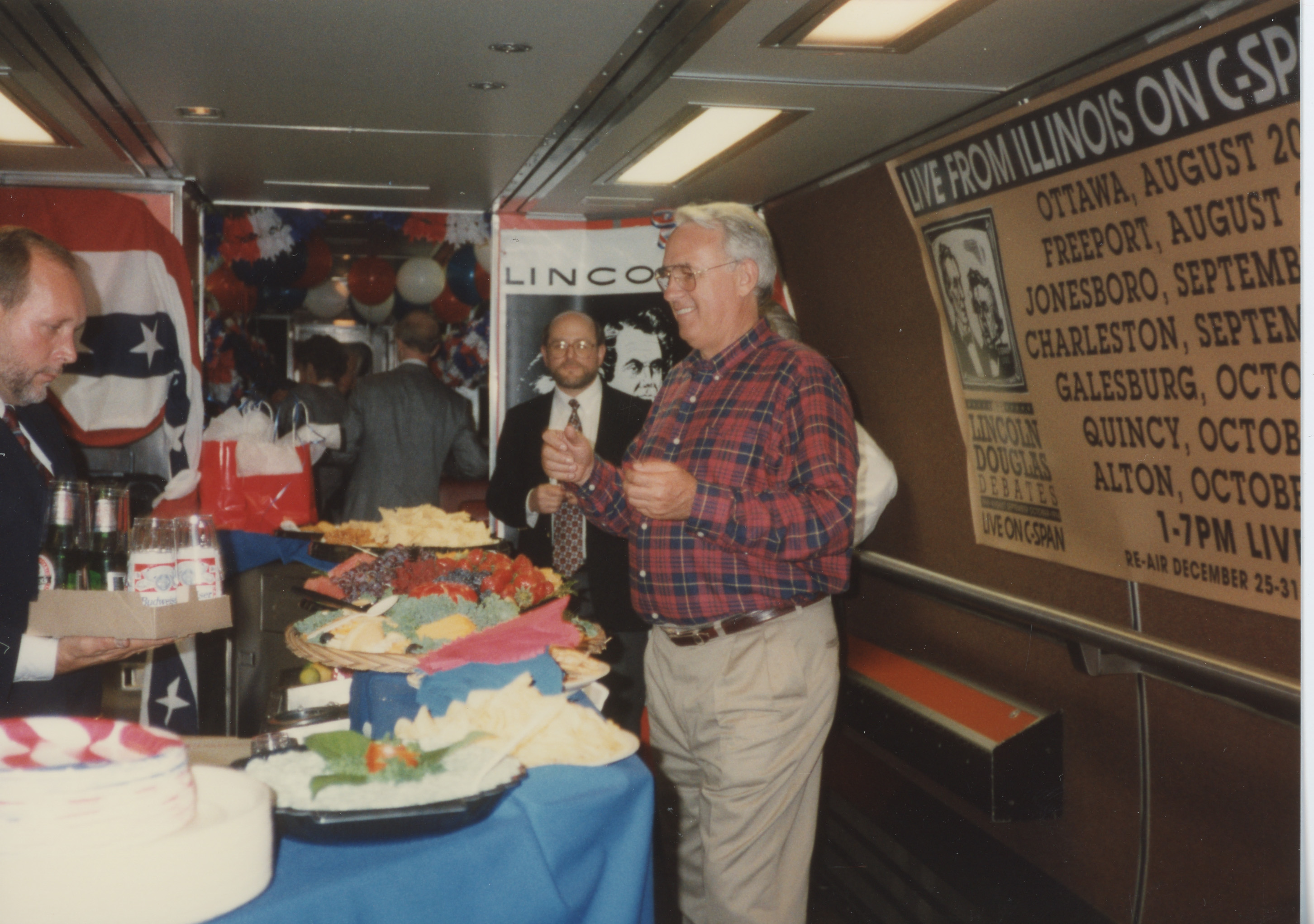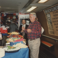 People stand near a table filled with various food and drink refreshments. Decorations on the walls around them celebrate the Lincoln-Douglas Debates series. This photograph was taken while the C-SPAN crew was en route from Chicago, Illinois to Galesburg, Illinois while filming the Lincoln-Douglas Debates series.