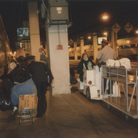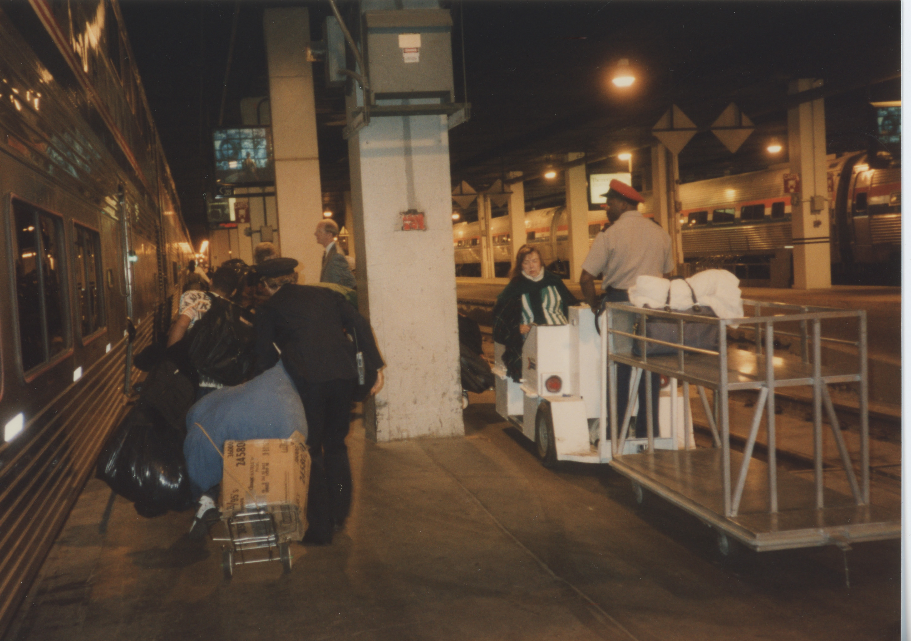 People pulling luggage carts past a stationary train. This photograph was taken while the C-SPAN crew was en route from Chicago, Illinois to Galesburg, Illinois while filming the Lincoln-Douglas Debates series.