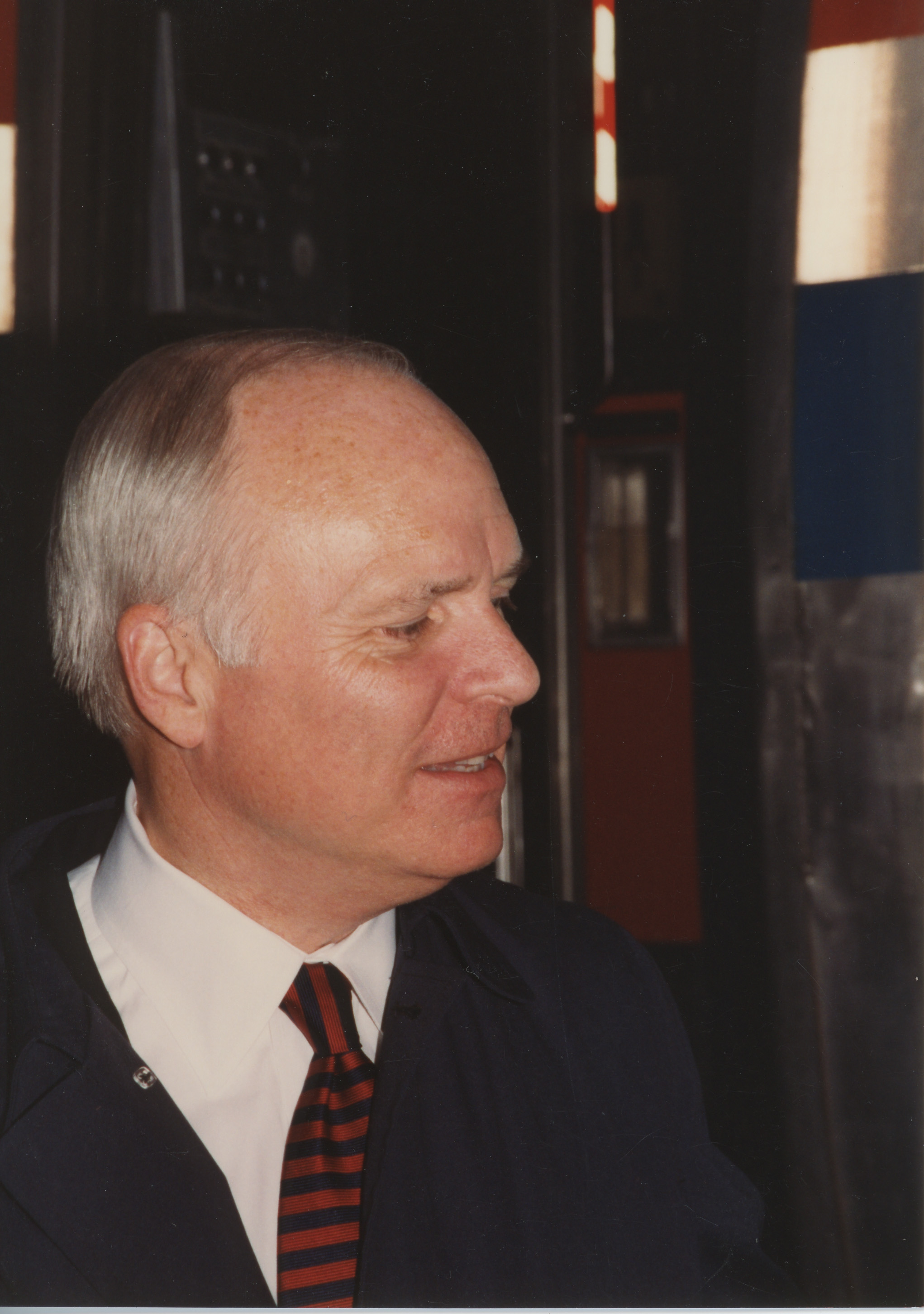 Close up photo of Brian Lamb. This photograph was taken while the C-SPAN crew was en route from Chicago, Illinois to Galesburg, Illinois while filming the Lincoln-Douglas Debates series.