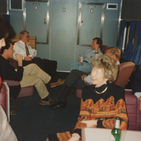 A group of people sit in chairs in a train car chatting with each other. This photograph was taken while the C-SPAN crew was en route from Chicago, Illinois to Galesburg, Illinois while filming the Lincoln-Douglas Debates series.