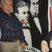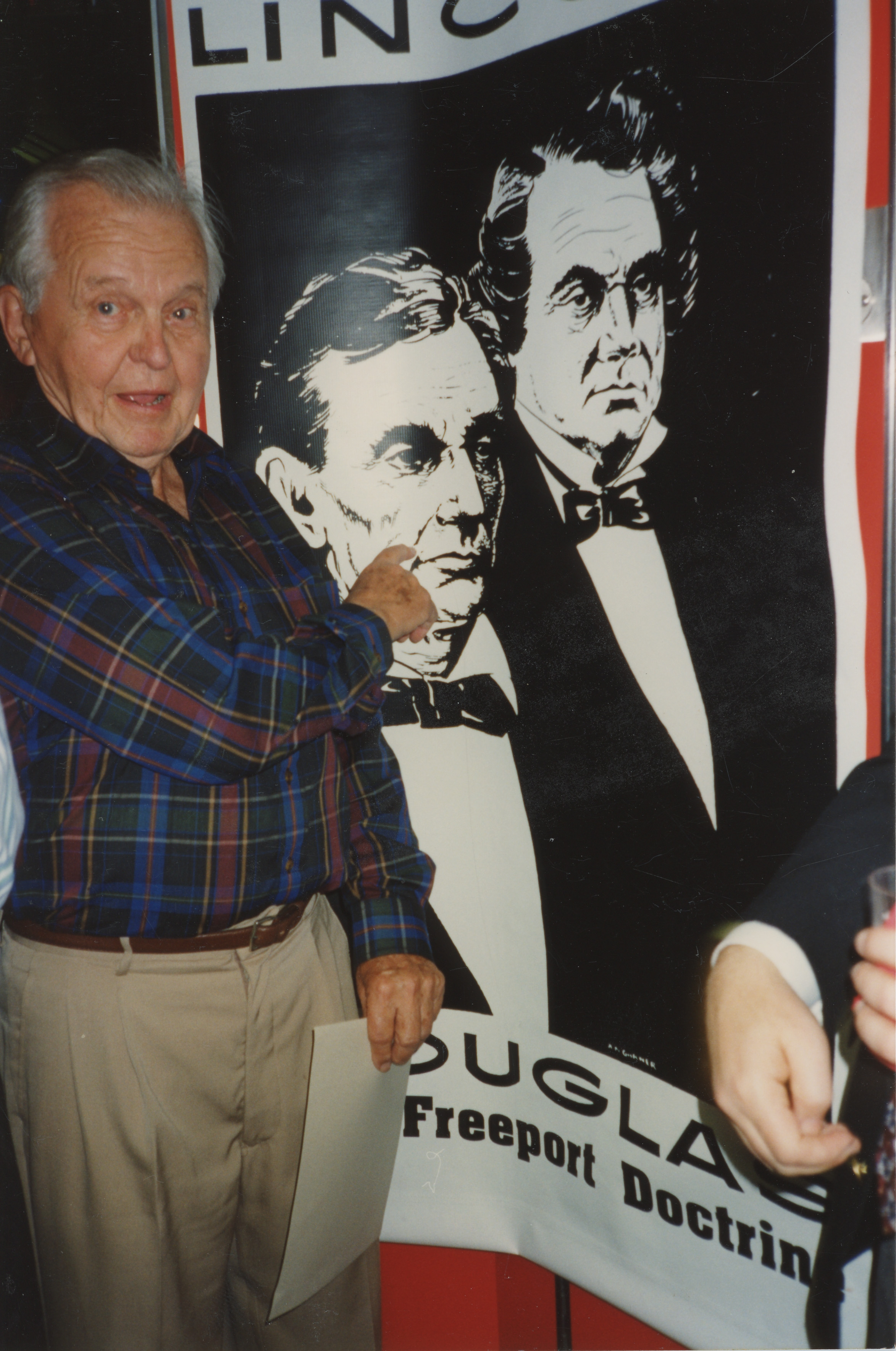 An elderly person points at a black-and-white poster of Stephen Douglas and Abraham Lincoln. This photograph was taken while the C-SPAN crew was en route from Chicago, Illinois to Galesburg, Illinois while filming the Lincoln-Douglas Debates series.
