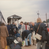 People stand on an outdoor train platform in Galesburg, Illinois. This photograph was taken while the C-SPAN crew was en route from Chicago, Illinois to Galesburg, Illinois while filming the Lincoln-Douglas Debates series.