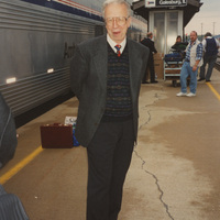 A person stands on the platform at the Galesburg, Illinois train station near some luggage. This photograph was taken while the C-SPAN crew was en route from Chicago, Illinois to Galesburg, Illinois while filming the Lincoln-Douglas Debates series.
