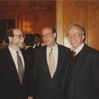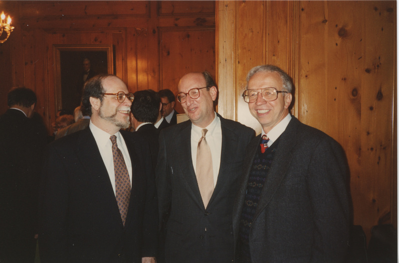 Three people pose together in a wood-paneled room. This photograph was taken as part of filming C-SPAN's Lincoln-Douglas Debates series in Galesburg, Illinois.