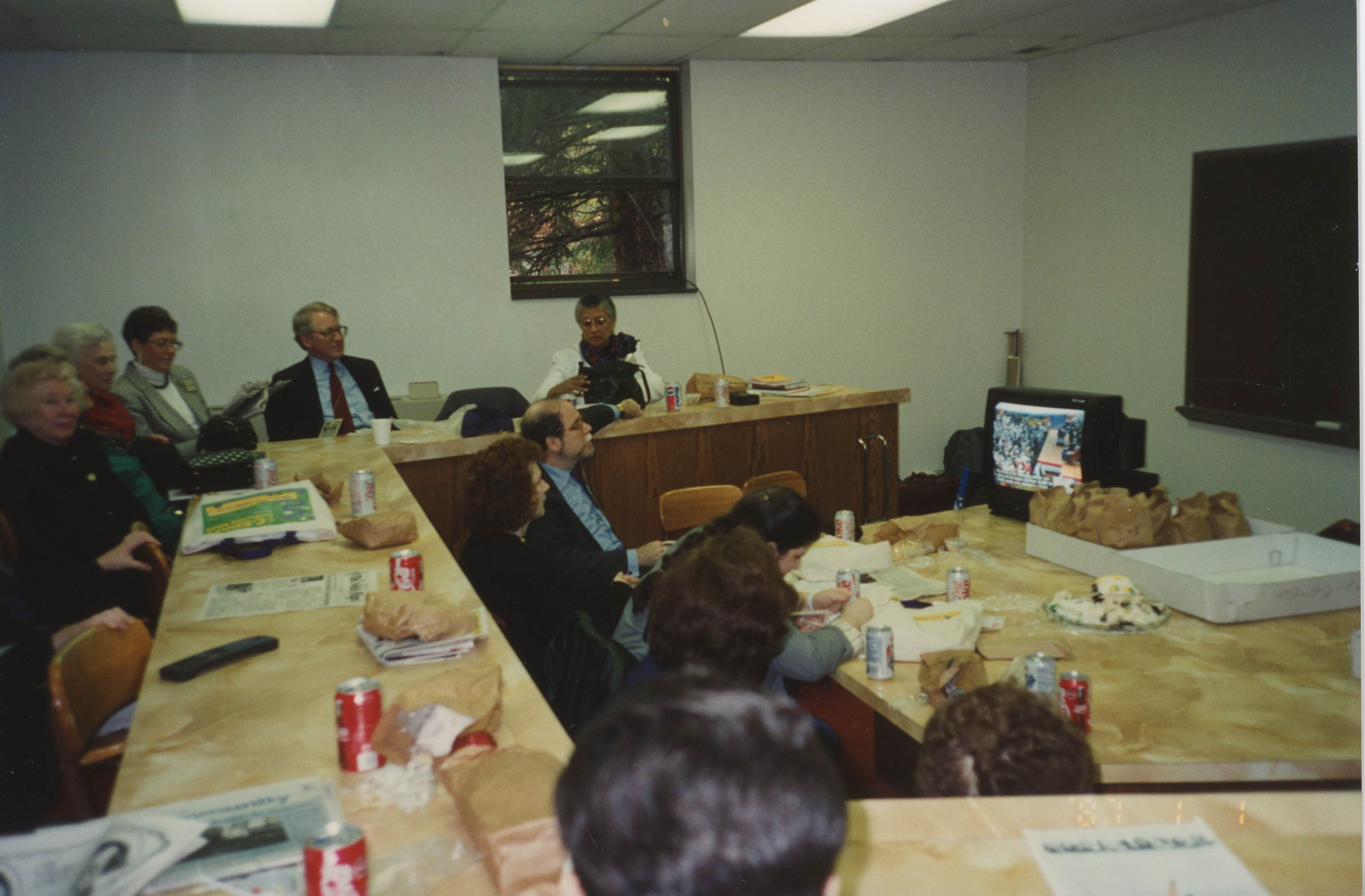 A group of people sit in a small type of auditorium and watch a screen. This photograph was taken as part of filming C-SPAN's Lincoln-Douglas Debates series in Galesburg, Illinois.