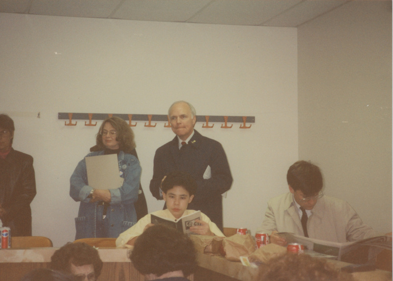 Brian Lamb stands next to a person in a room with some people sit at tables and read. This photograph was taken as part of filming C-SPAN's Lincoln-Douglas Debates series in Galesburg, Illinois.
