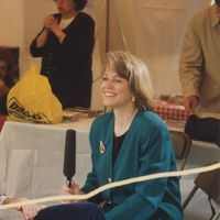 Susan Swain with microphone, Galesburg, Illinois