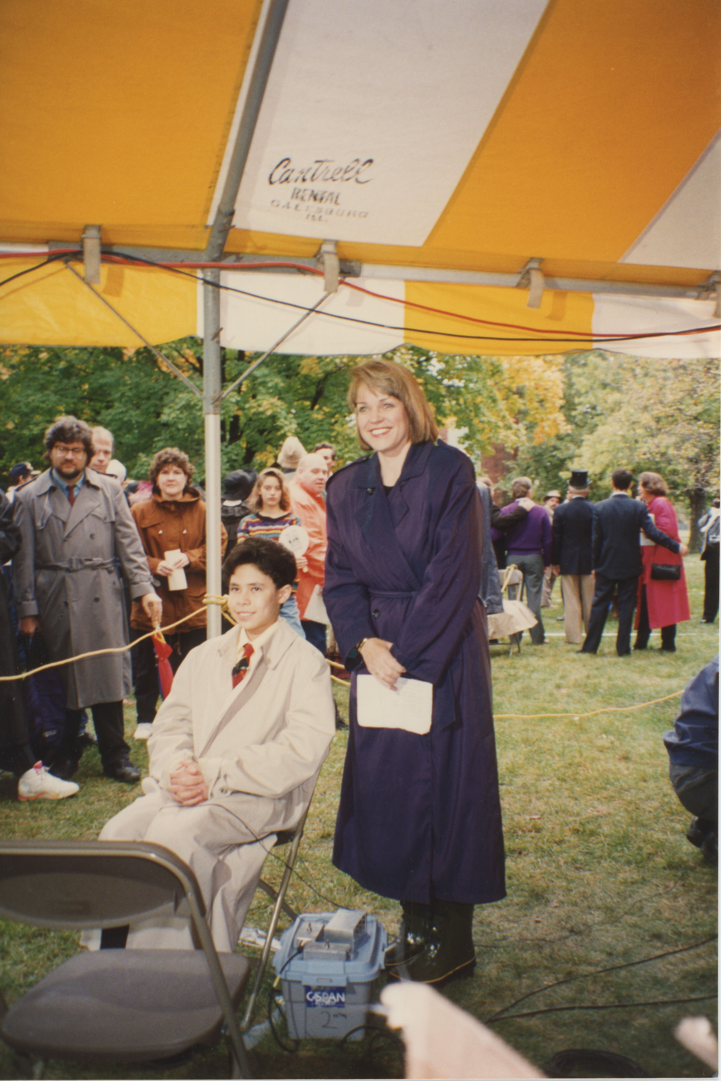Susan Swain stands next to a seated young person underneath an outdoor tent. Other adults stand nearby. This photograph was taken as part of filming C-SPAN's Lincoln-Douglas Debates series in Galesburg, Illinois.