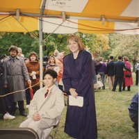 Susan Swain and person in outdoor tent, Galesburg, Illinois