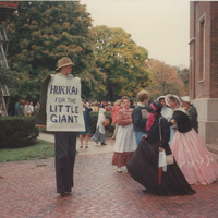 People in 19th-century period costume wait in line outside a large brick building while a young person on stilts holds a sign which says "Hurrah for the Little Giant." This photograph was taken as part of filming C-SPAN's Lincoln-Douglas Debates series in Galesburg, Illinois.