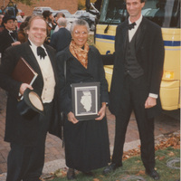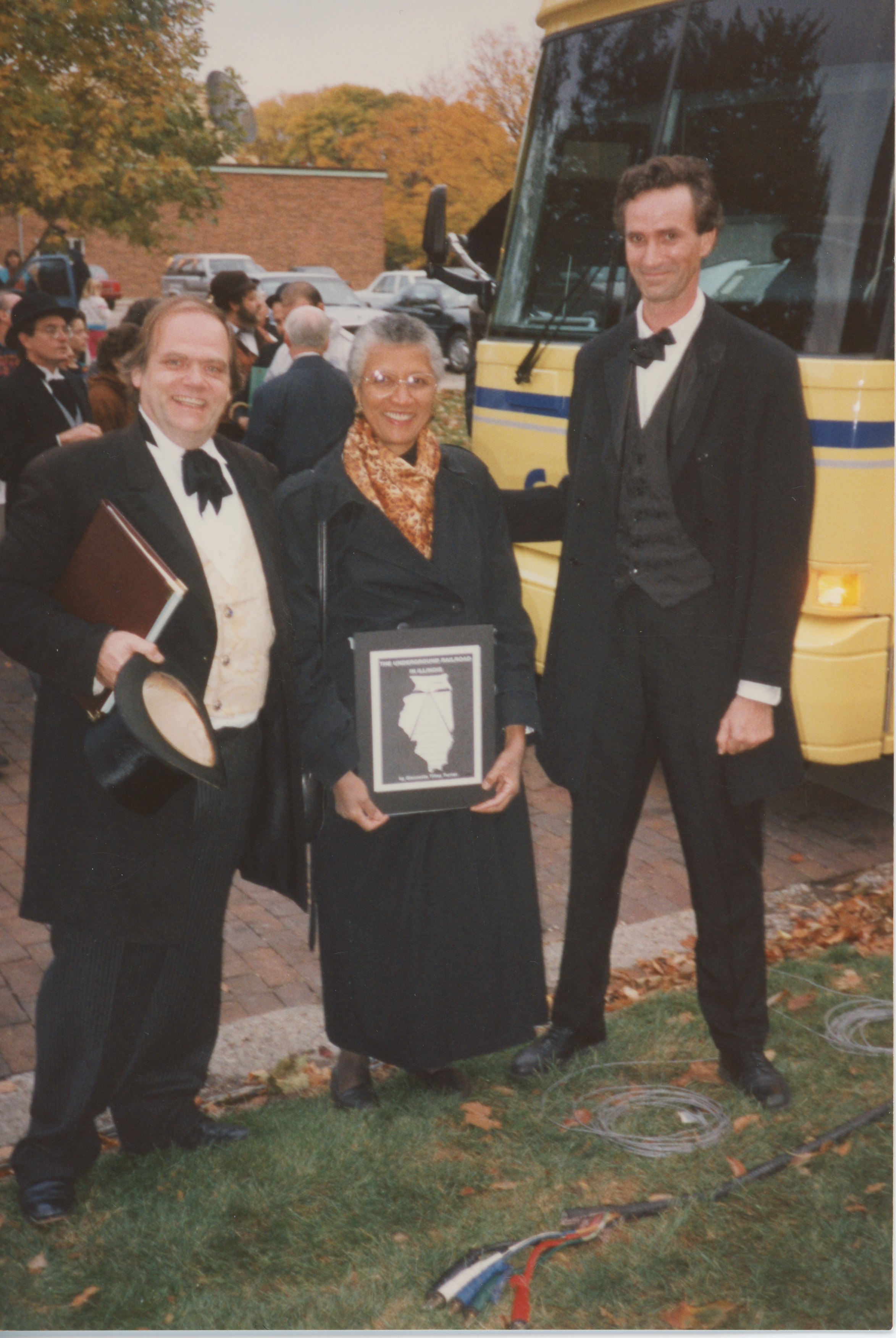Glennette Tilley Turner, holding a copy of "The Underground Railroad in Illinois" stands between two people--one dressed as Stephen Douglas, the other dressed as Abraham Lincoln. The C-SPAN School Bus is parked behind them. This photograph was taken as part of filming C-SPAN's Lincoln-Douglas Debates series in Galesburg, Illinois.