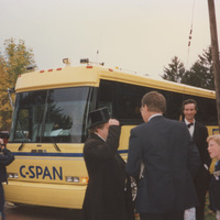 A large group of people, including some in 19th-century period costume, stand around the C-SPAN Bus. This photograph was taken as part of filming C-SPAN's Lincoln-Douglas Debates series in Galesburg, Illinois.
