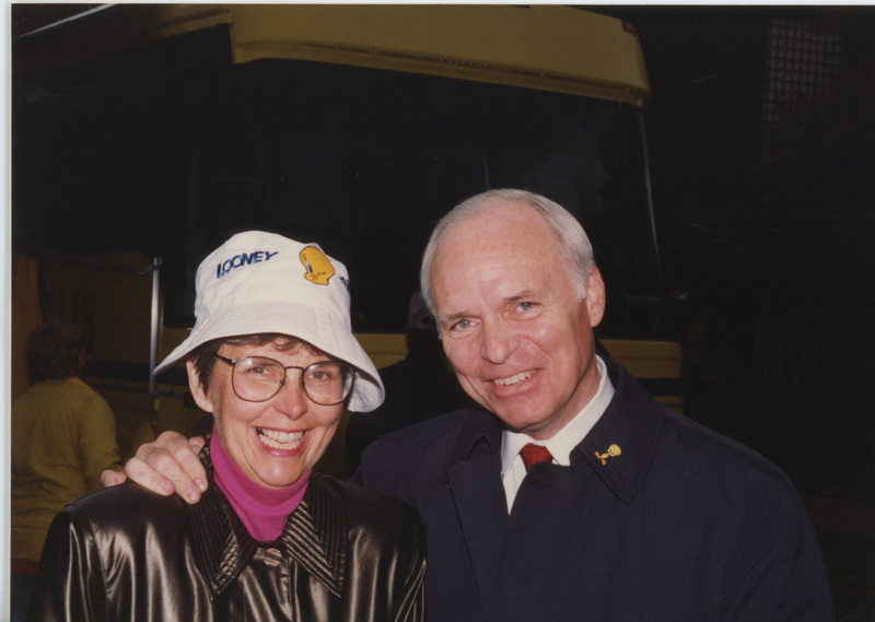 Brian Lamb poses with a person wearing a black jacket and hat which reads "Looney" and has a patch of Tweety Bird on it. This photograph was taken as part of filming C-SPAN's Lincoln-Douglas Debates series in Galesburg, Illinois.
