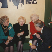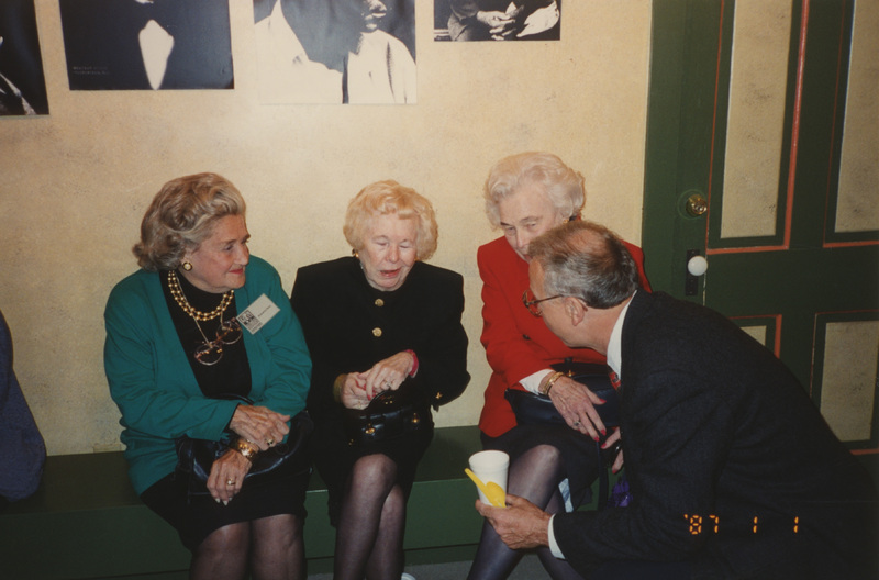 Mem Constidine, Eileen O'Gara, and Bobbsie Ross sit and speak with a person. This photograph was taken as part of filming C-SPAN's Lincoln-Douglas Debates series in Galesburg, Illinois.