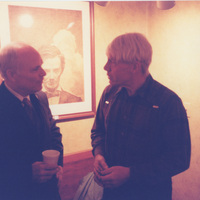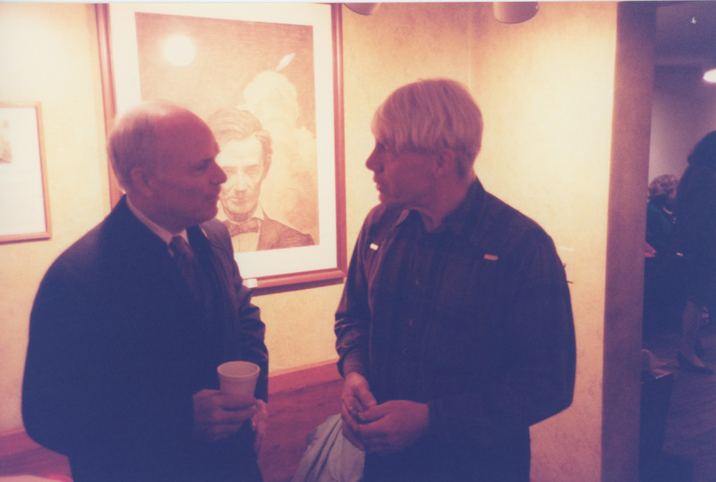 Brian Lamb speaks with Carl Sandburg impersonator Nick Earl in a hallway. This photograph was taken as part of filming C-SPAN's Lincoln-Douglas Debates series in Galesburg, Illinois.