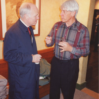 Brian Lamb speaks with Carl Sandburg impersonator Nick Earl in a hallway. This photograph was taken as part of filming C-SPAN's Lincoln-Douglas Debates series in Galesburg, Illinois.