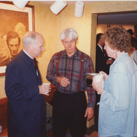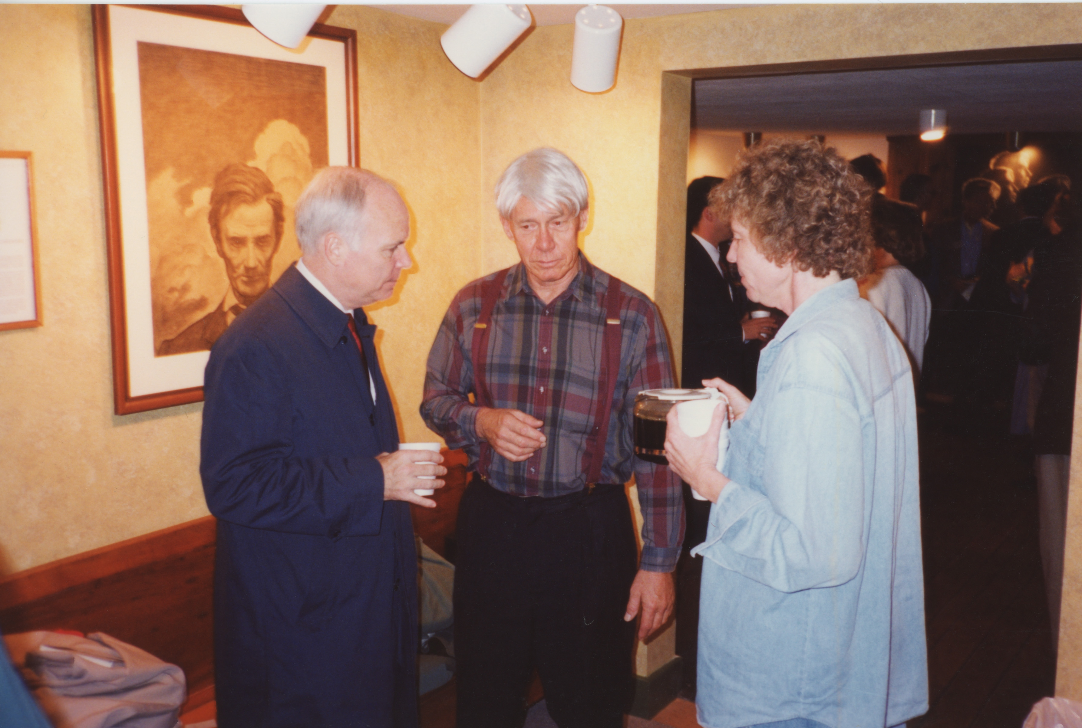 Brian Lamb stands in a hallway, speaking with Nick Earl (middle) and a person holding a coffee pot. This photograph was taken as part of filming C-SPAN's Lincoln-Douglas Debates series in Galesburg, Illinois.