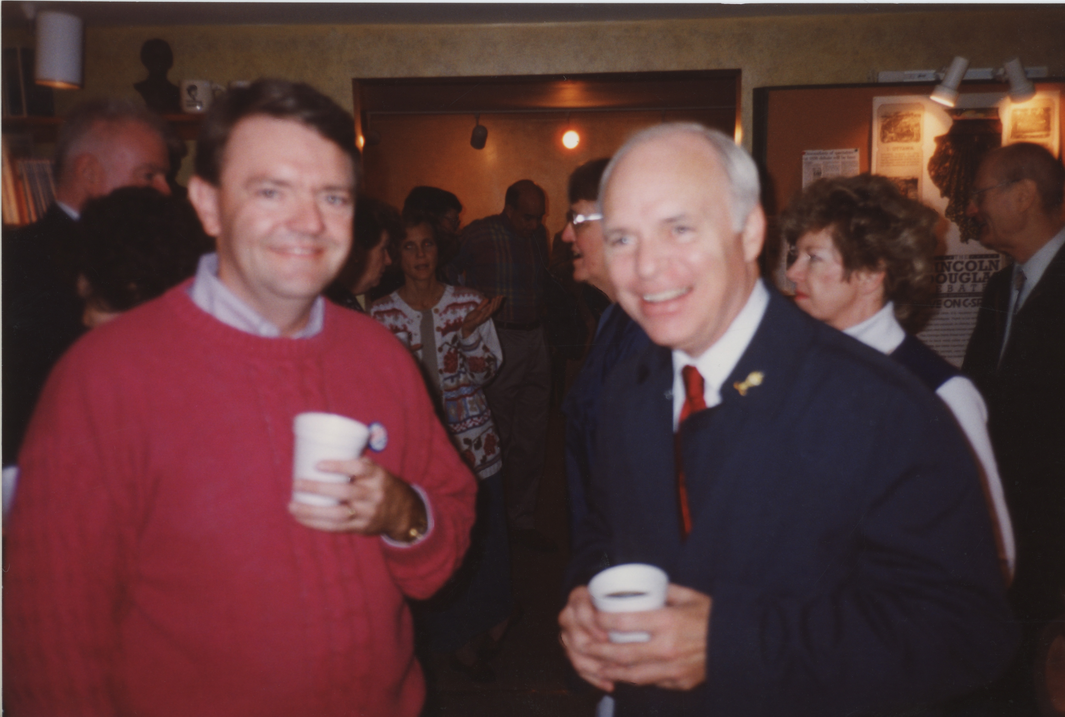 Brian Lamb and another person stand next to each other holding styrofoam cups. The room they are in is crowded. This photograph was taken as part of filming C-SPAN's Lincoln-Douglas Debates series in Galesburg, Illinois.